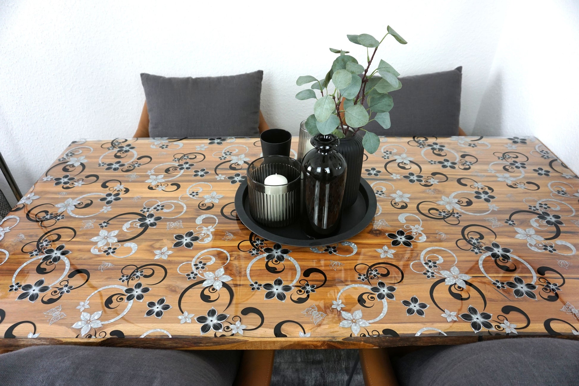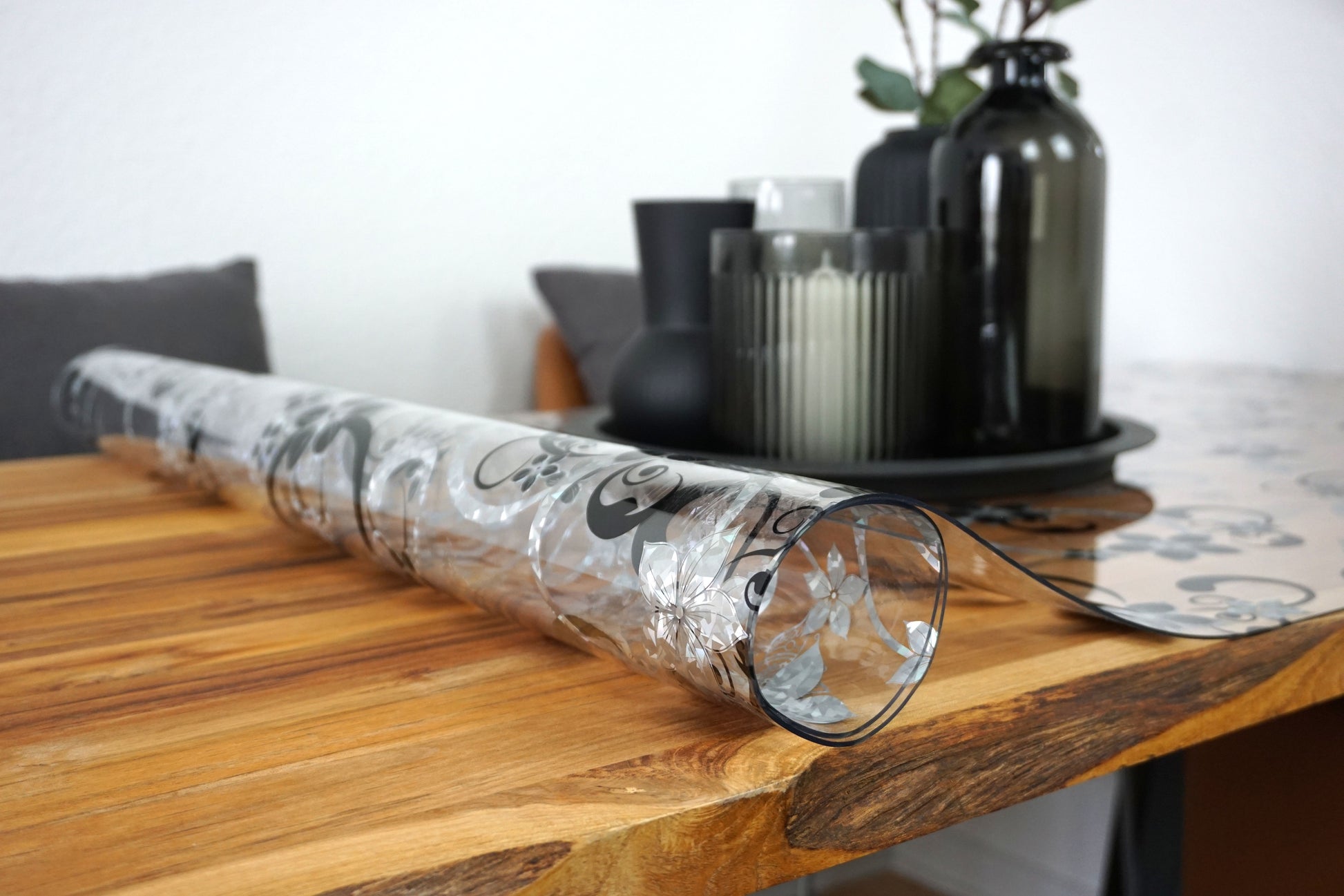 Unsere gemusterte Tischfolie schützt Ihren Esstisch, Couchtisch, Schreibtisch, Arbeitstisch, Verkaufstheke perfekt gegen Beschädigungen, Kratzer, Scheuerstellen und Schmutz.