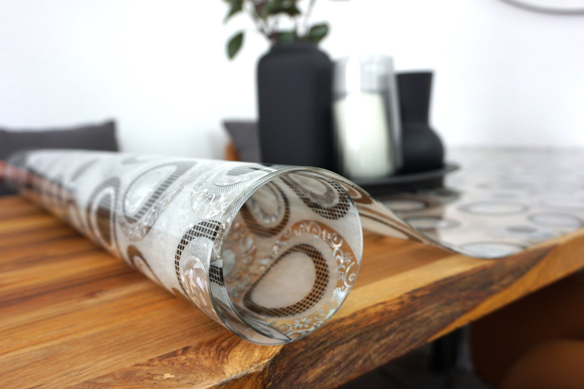 Unsere gemusterte Tischfolie schützt Ihren Esstisch, Couchtisch, Schreibtisch, Arbeitstisch, Verkaufstheke perfekt gegen Beschädigungen, Kratzer, Scheuerstellen und Schmutz.